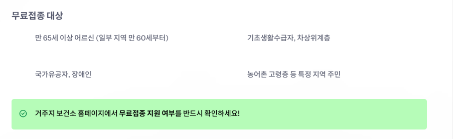 - 정보를 아는 것이 곧 혜택 – 무료접종 지원 여부는 반드시 거주지 보건소에서 확인하세요.