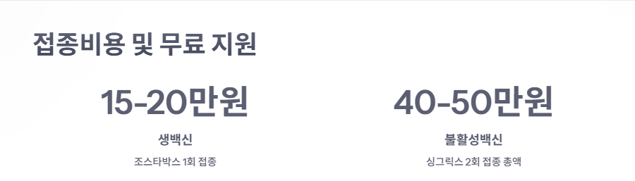 - 불활성백신(싱그릭스): 1회 20만~ 25만 원, 총 2회 = 40만50만 원