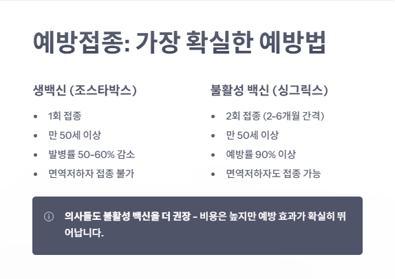 - 예방접종은 가장 확실한 예방법이며, 특히 불활성 백신(싱그릭스) 효과가 높습니다.