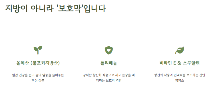 | 올레산(불포화지방산) | 혈관 건강, 염증 감소 |