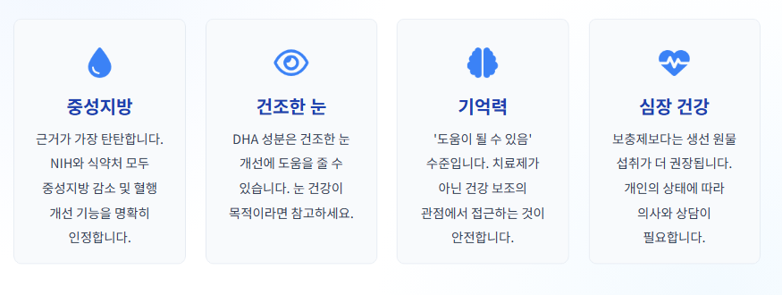 “중성지방·혈행 쪽은 비교적 근거가 잘 정리돼 있다”가 현실적인 결론입니다.