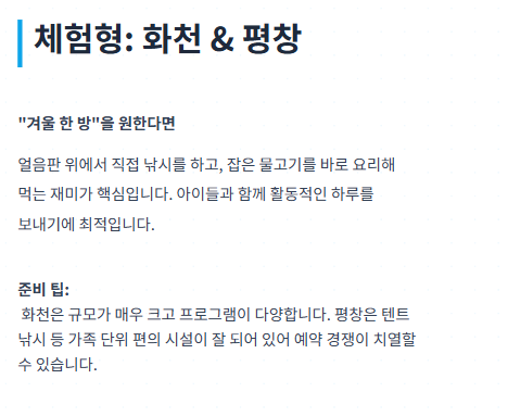 | 화천 산천어축제 | 2026.1.10 ~ 2.1 | “겨울 한 방” 체험형 | 얼음낚시·맨손잡기·눈썰매 등 규모감 |